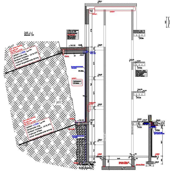 Beregninger og tegninger for garasje i armert betong og bakvegg (høyde: fire etasjer)